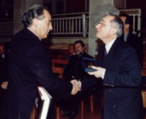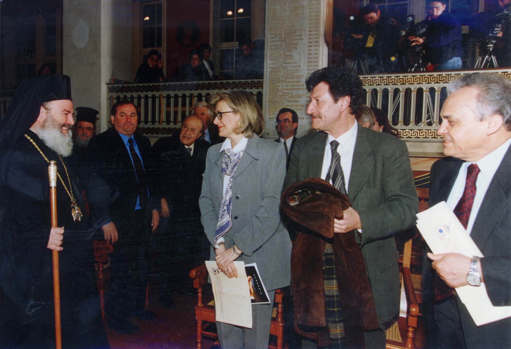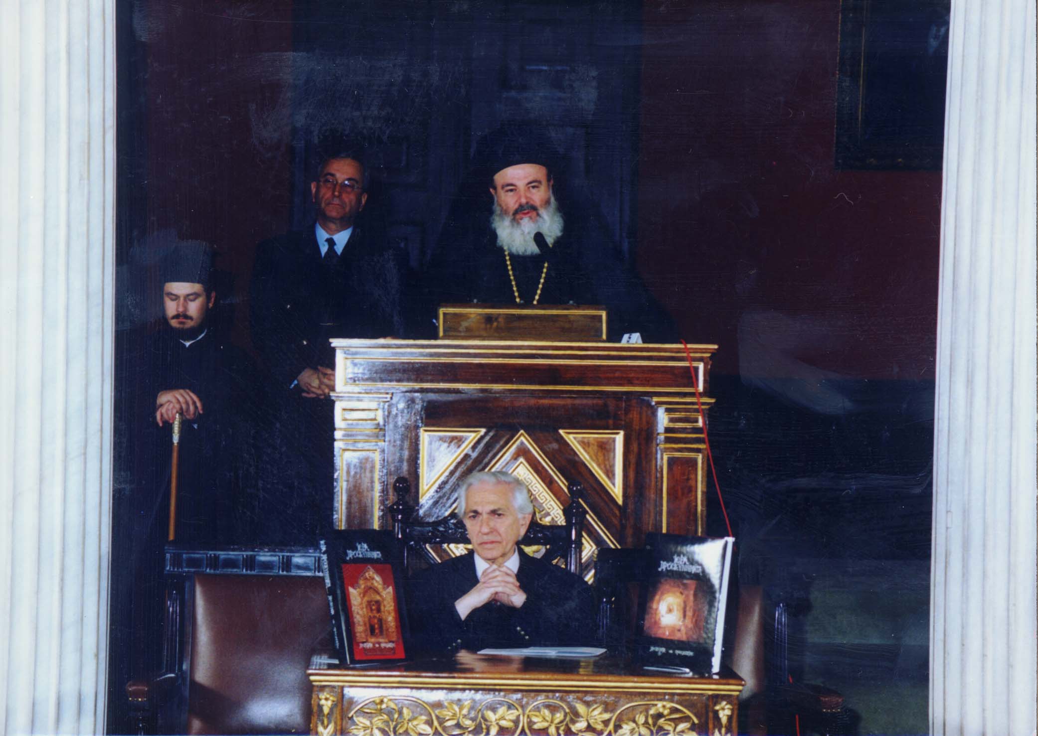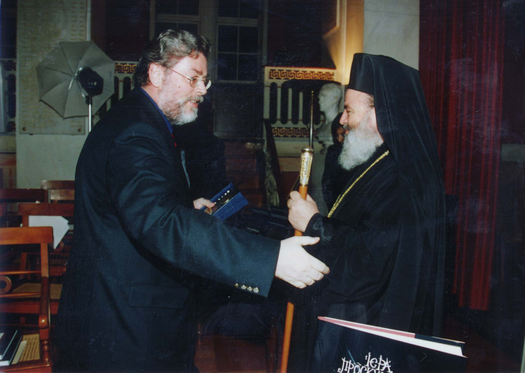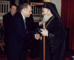 Ο Αρχιεπίσκοπος Αθηνών και Πάσης Ελλάδος κ.Χριστόδουλος, ενώ παραλαμβάνει από τον Καθηγητή του Α.Π.Θ. κ.Αγγελόπουλο Αθανάσιο το δίτομο έργο "Ιερά Προσκυνήματα - Προπύργια της Ορθοδοξίας", που εντάσσεται στις εργασίες του Β κύκλου του Προγράμματος