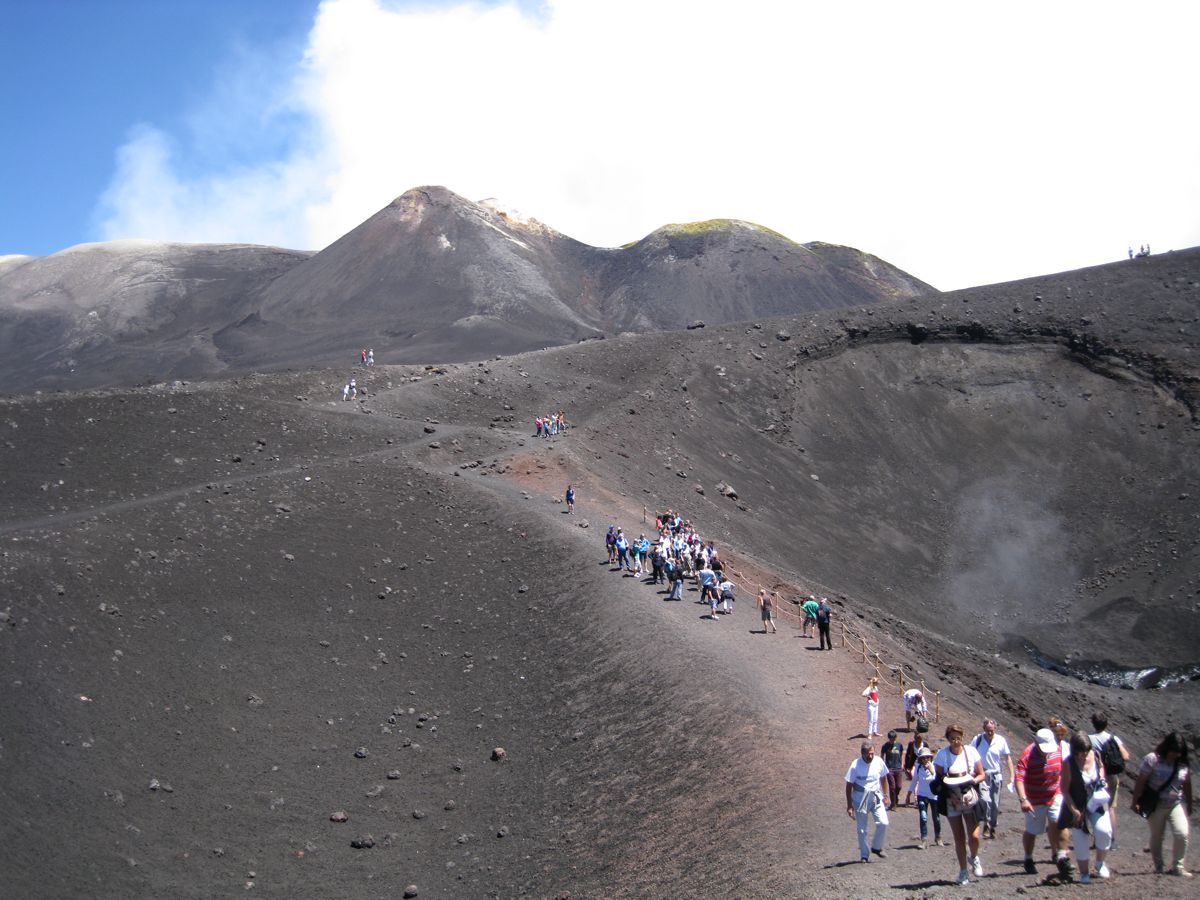 Το μεγαλύτερο ηφαίστειο της Ευρώπης, η Αίτνα. Φθάσαμε μέχρι τα καταφύγια και τους πρώτους κρατήρες. Περίπου 10 άτομα από το γκρουπ τόλμησαν και είχαν μια συγκλονιστική εμπειρία, την ανάβαση με τελεφερίκ και κατόπιν με τζιπ 4×4, κάτι σαν τα δικά μας ΡΕΟ του στρατού στον Κεντρικό Κρατήρα. Στα 2.900 μ. είδαμε τις ζώνες των κρατήρων και τη θέα του βουνού που άφησαν οι εκρήξεις του 2001, 2002 – 2003, 2006 και 2007. Πήγαμε στη ζώνη Belvedere και θαυμάσαμε μια αξέχαστη θέα του ηφαιστειογενούς βουνού και της Bove Valley όπως λέγεται το μέρος αυτό που το παρομοιάζουν σαν το μόνο μέρος στη γη που μοιάζει με τον Άρη. Όλο το τοπίο έχει τη χαρακτηριστική λάβα και είδαμ επίσης σπηλιές και ποτάμια ξεραμένης λάβας.