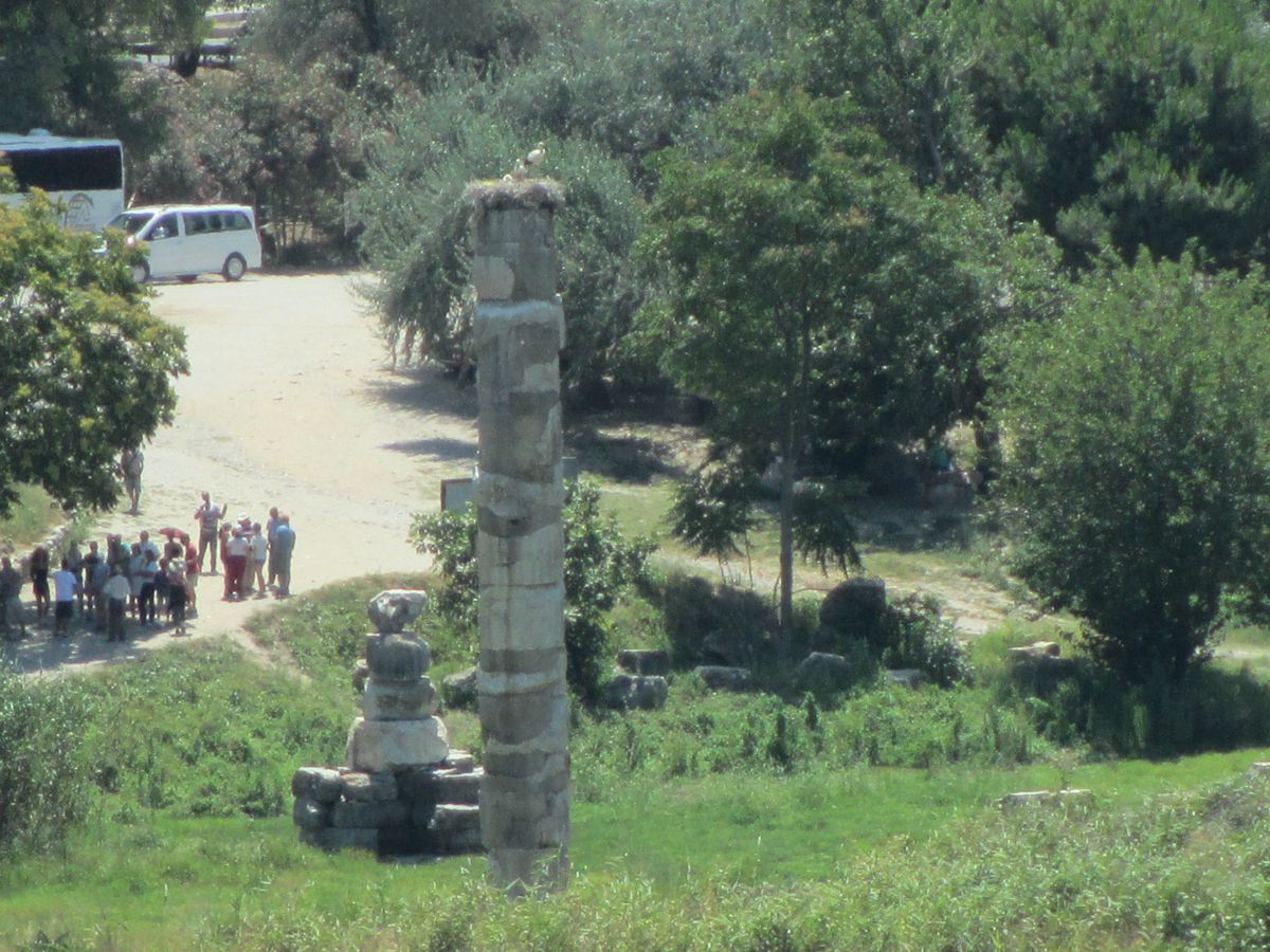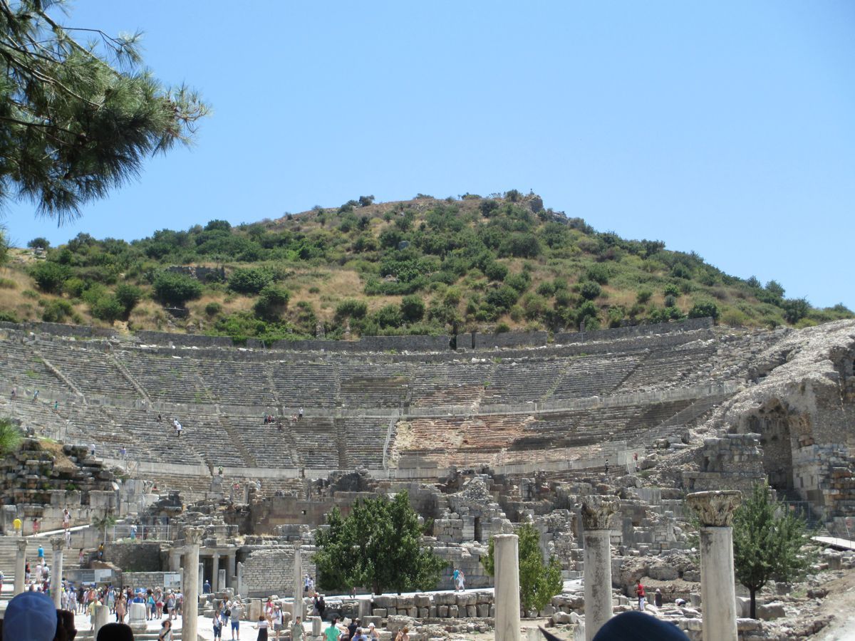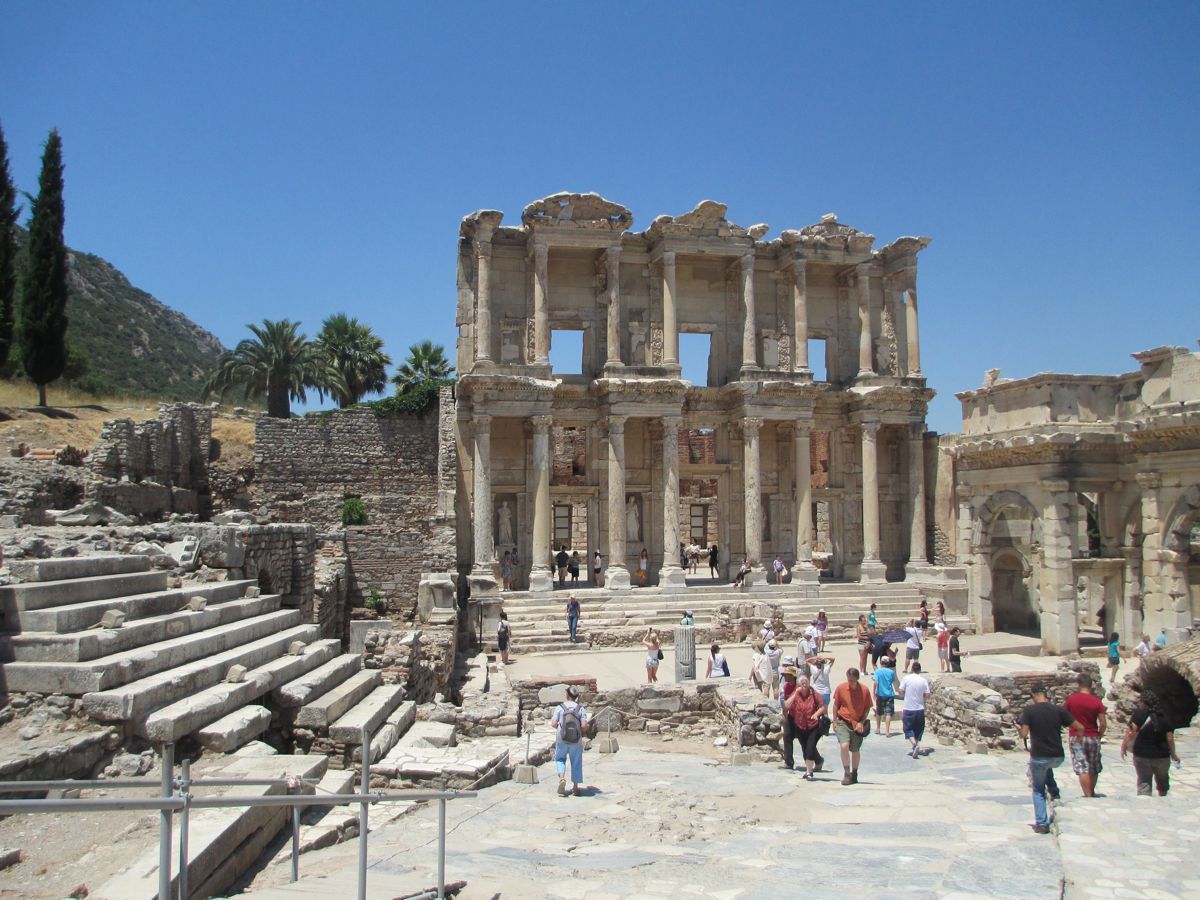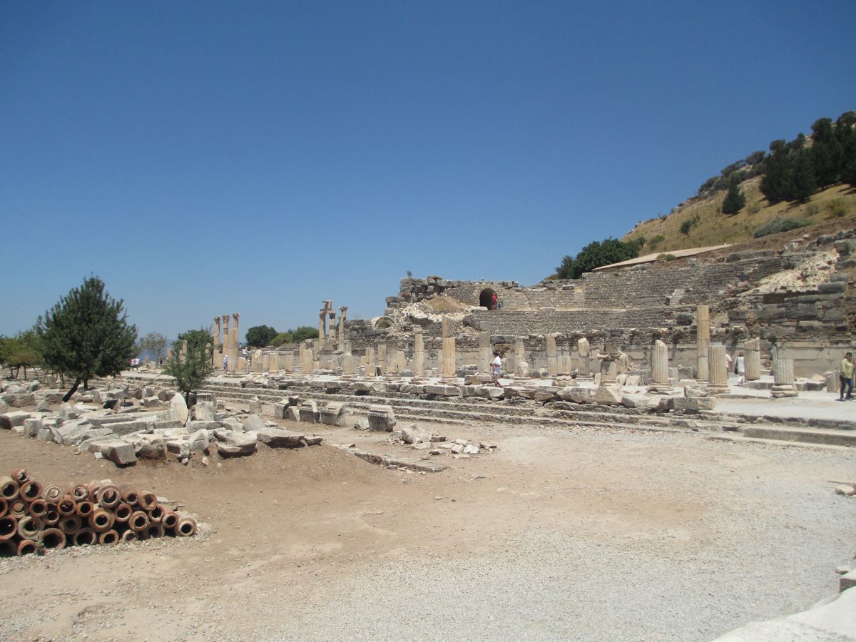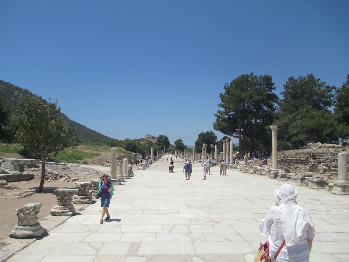 Διασχίσαμε τον Μαίανδρο ποταμό και φθάσαμε επιτέλους στην Έφεσο. 1.800 χρόνια ζωής αριθμεί η Έφεσος, από τον 11ο π.Χ. έως τον 7ο αιώνα μ.Χ. Μία απ΄ τις σημαντικότερες πόλεις των μικρασιατικών παραλίων, σε προνομιακή θέση, αφού από αυτήν ξεκινούσε δρόμος που διέσχιζε ολόκληρη τη Μ. Ασία. Αρχικά χτισμένη πάνω στη θάλασσα, αλλά λόγω των προσχώσεων του παρακείμενου ποταμού Καΰστρου, αργότερα μετακινήθηκε δυτικότερα. Τον 8ο π.Χ. αιώνα, η Έφεσος έγινε το οικονομικό κέντρο της Μικράς Ασίας. Τον 6ο π.Χ αιώνα πέρασε υπό την κυριαρχία του Κροίσου, διατηρώντας όμως την αυτονομία της, στη συνέχεια, διαδοχικά από την κυριαρχία του Κύρου και των επόμενων Περσών βασιλιάδων, ενώ απελευθερώθηκε το 334 π.Χ. από τα στρατεύματα του Μεγάλου Αλεξάνδρου. Μάλιστα αναφέρεται ότι, επειδή ο ναός της Εφεσίου Αρτέμιδος κάηκε τη μέρα που γεννήθηκε ο Μ. Αλέξανδρος, γι’ αυτό περνώντας ο ίδιος από εκεί έδωσε χρήματα για την αναστήλωση και ανακαίνισή του. Η Έφεσος ήταν πόλη αφιερωμένη στην Άρτεμη. Η πόλη είχε στην αρχή ένα μικρό ναό, που αργότερα καταστράφηκε, για να χτιστεί το μεγαλόπρεπο Αρτεμίσιο, που η κατασκευή του κράτησε 120 χρόνια. Ο ναός αυτός, ένα από τα επτά θαύματα του αρχαίου κόσμου, ήταν το μεγαλύτερο οικοδόμημα της Ιωνίας. Το ιερό της Αρτέμιδος υπηρετούσαν ιερείς και ιέρειες παρθένοι, που ονομάζονταν Μεγάβυζοι. Ο ναός καταστράφηκε ξαναχτίστηκε και τελικά τα μάρμαρά του έγιναν οικοδομικά υλικά για διάφορα βυζαντινά μνημεία στην Κωνσταντινούπολη. Σήμερα ελάχιστα κομμάτια από το ναό έχουν περισυλλεγεί και τοποθετηθεί κατά τέτοιον τρόπο, ώστε δημιουργούν μία στήλη, η οποία βρίσκεται σε σημείο μεταξύ του αρχαιολογικού χώρου και των ερειπίων της εκκλησίας του Αγίου Ιωάννου του Ευαγγελιστή. Περιηγηθήκαμε σε δύο αγορές, στο βουλευτήριο και στο πρυτανείο. Διαβήκαμε τη λεωφόρο των Κουρητών και βρεθήκαμε μπροστά στην περίφημη Βιβλιοθήκη του Κέλσου (2ος αιώνας μ.Χ.), στην αναστήλωση της οποίας προέβησαν Αυστριακοί αρχαιολόγοι. Εντύπωση σε όλους μας έκανε ότι κατά μήκος της λεωφόρου των Κουρητών υπήρχαν δεξιά και αριστερά βάθρα αγαλμάτων που έφεραν επιγραφές, στις οποίες αναγράφονταν οι νόμοι της πόλης. Ήταν λοιπόν αδύνατον σε κάποιον να τους αγνοεί, αφού στην καθημερινότητά του τους είχε συνεχώς μπροστά του. Σε περίπτωση δε που κάποιος ήταν αγράμματος, πάλι δεν δικαιολογούνταν η άγνοια του νόμου, αφού σε ειδικούς δημόσιους χώρους, όπως τα λουτρά, υπήρχαν άνθρωποι επιφορτισμένοι με το καθήκον να διαβάζουν δυνατά τους νόμους, ώστε να ακούγονται από όλους. Από τη Βιβλιοθήκη του Κέλσου ξεκινά η δεύτερη μεγάλη λεωφόρος της πόλης. Την περπατήσαμε ώσπου φθάσαμε στο περίφημο θέατρο της Εφέσου, το μεγαλύτερο ελληνικό αρχαίο θέατρο, που αργότερα μετατράπηκε σε αρένα. Μία τρίτη οδός, η Αρκαδιανή Λεωφόρος λιμένος, οδηγούσε από το θέατρο έως τη θάλασσα, μέσω της οποίας οι άμαξες μετέφεραν τα απαραίτητα από και προς το λιμάνι.