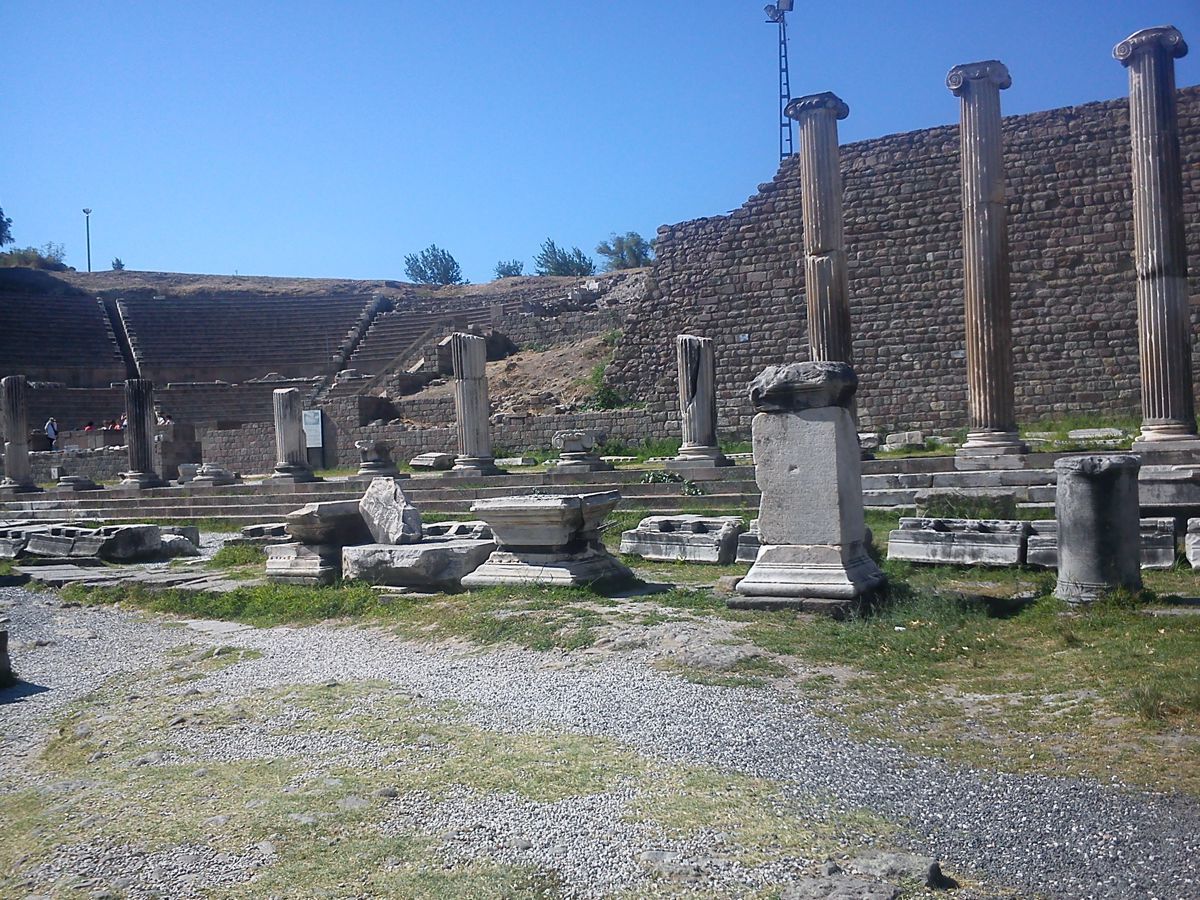 Το επόμενο πρωί ξεκινήσαμε με προορισμό την Πέργαμο. Οι μαρτυρίες που αφορούν στην πόλη της Περγάμου ανάγονται στην 1η χιλιετία π.Χ. Το όνομά της κατά μία παράδοση, το οφείλει στον Πέργαμο, γιο του Νεοπτόλεμου και της Ανδρομάχης. Χτισμένη σε μοναδικής ομορφιάς θέση, 238 μέτρα πάνω από τη θάλασσα, συνδυάζει δωρικά και ιωνικά στοιχεία. Κάποιοι μάλιστα υποστηρίζουν ότι έχει τα ωραιότερα τείχη του ελληνικού κόσμου. Καυχάται για την Ακρόπολη, το Ασκληπιείο, την παλαίστρα και το εντυπωσιακό της θέατρο 10.000 θέσεων. Μέχρι την εκστρατεία του Μεγάλου Αλεξάνδρου δεν ήταν ιδιαίτερα σημαντική. Κατά τη διάρκεια της εκστρατείας εξελίχθηκε σε μια από τις σημαντικότερες πόλεις της Μυσίας. Καταλήφθηκε από τους Ρωμαίους και έγινε το μεγαλύτερο εμπορικό, πολιτικό και στρατιωτικό κέντρο της ρωμαϊκής επαρχίας της Ασίας. Η βιβλιοθήκη της ήταν από τις μεγαλύτερες του κόσμου, αλλά ο Αντώνιος χάρισε τα βιβλία της στη βασίλισσα της Αιγύπτου, την Κλεοπάτρα. Στην Πέργαμο άκμασε και ο διάσημος γιατρός της αρχαιότητας Γαληνός. Ο περίφημος «Βωμός του Διός Σωτήρος και της Αθηνάς Νικηφόρου», έργο πολλών καλλιτεχνών, κτίστηκε από το βασιλιά της Περγάμου Ευμένη τον Β’ (197-159 π.Χ.) για να θυμίζει τις νίκες των Περγαμηνών εναντίον των Γαλατών, οι οποίοι, στις αρχές του 3ου αιώνα π.Χ., πέρασαν από την Ευρώπη στην Ασία και, με λεηλασίες προκάλεσαν τεράστιες καταστροφές στις ελληνικές πόλεις, από τον Ελλήσποντο ως την Έφεσο και τη Μίλητο. Οι νίκες αυτές χάρισαν στο βασίλειο της Περγάμου την απόλυτη κυριαρχία του στην Ανατολική Μεσόγειο. Δεν είναι γνωστό σε ποιον οφείλεται το σχέδιο της γλυπτικής σύνθεσης, που φιλοτεχνήθηκε από το 180 έως 150 π.Χ., ούτε ποιός καθόρισε τις κύριες γραμμές της σύνθεσης για την οποία εργάστηκαν 15 γλύπτες. Αποκαλύφθηκε κατά τις ανασκαφές των εθνικών μουσείων της Γερμανίας στην Πέργαμο από το 1878 ως το 1886. Σήμερα βρίσκεται στο Μουσείο της Περγάμου, στο Βερολίνο. Πρέπει να αναφερθεί ότι η Πέργαμος έδωσε το όνομά της στην περγαμηνή, δηλαδή στο υλικό εκείνο γραφής για σελίδες βιβλίου, κώδικα ή χειρογράφου, που παρασκευαζόταν από δέρμα μόσχου, προβάτου ή αίγας. Μπορούσε κανείς να τη διπλώσει και να γράφει και στις δύο πλευρές της. Η εξάρτηση της πόλης από την Αίγυπτο ως αποκλειστική πηγή εισαγωγής τού παπύρου φέρεται να οδήγησε τον ηγεμόνα τής Περγάμου Ευμένη στην απόφαση να προωθήσει την παραγωγή περγαμηνής ως υποκατάστατου τού παπύρου κι έτσι καθιερώθηκε η χρήση της.