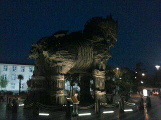 Σίγουρα απολαύσαμε τη νυχτερινή βόλτα μας κατά μήκος της προβλήτας, όταν προχωρώντας βρεθήκαμε μπροστά σε άλλο ξύλινο ομοίωμα του Δούρειου Ίππου. Το συγκεκριμένο δόθηκε ως δώρο στο Τσανάκαλε από τους συντελεστές της αμερικανικής ταινίας «Τροία», στην οποία και χρησιμοποιήθηκε.