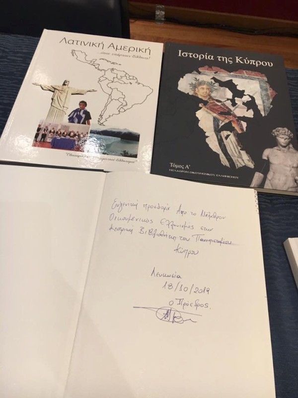 Στο τέλος της βιβλιοπαρουσίασης, ο πρόεδρος του Μελάθρου Οικουμενικού Ελληνισμού Σταύρος Πανουσόπουλος δώρισε την κεντρική βιβλιοθήκη του Πανεπιστημίου Κύπρου το έργο «Ιστορία της Κύπρου, Τόμος Α’».