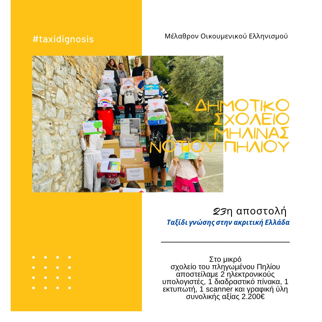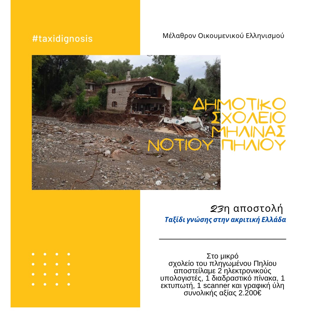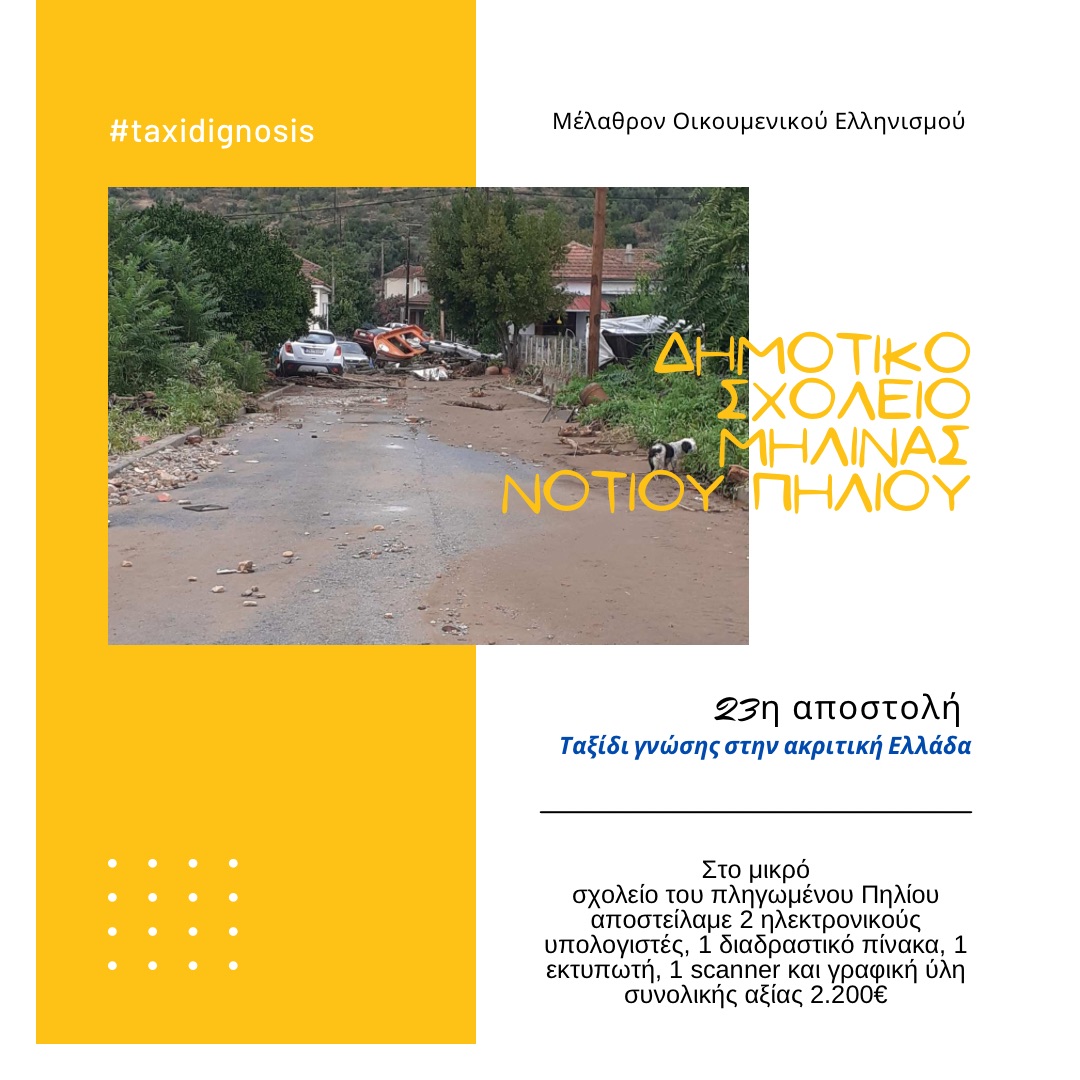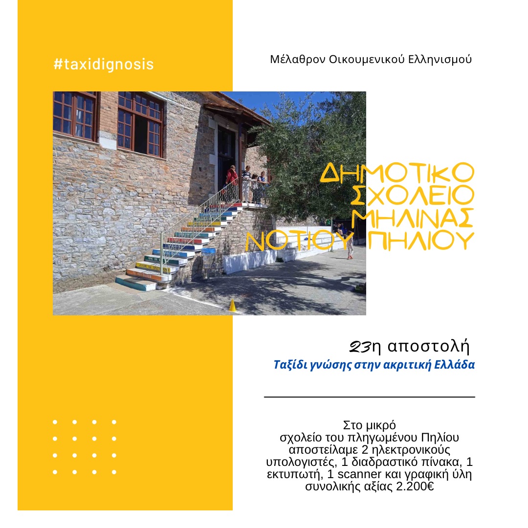 Το Μέλαθρον Οικουμενικού Ελληνισμού υλοποίησε την εικοστή τρίτη αποστολή στο σχολείο του Πηλίου και, συγκεκριμένα, απέστειλε: